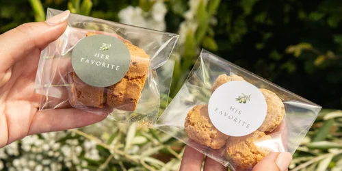 💛 Ook leuk: Ontwerp je eigen ronde stickers met ‘bedankt’ – helemaal in de stijl van jullie bruiloft. Plak ze op goodiebags of andere huwelijksbedankjes en deel ze na de ceremonie uit aan jullie gasten.