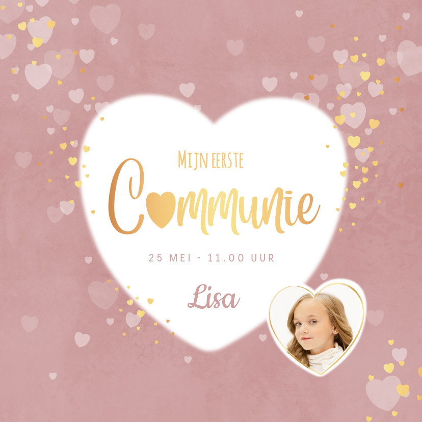 Stijlvolle oudroze communie uitnodiging met een groot hart met een goudkleurige tekst en een klein hartje fotokader op het communiekaartje.