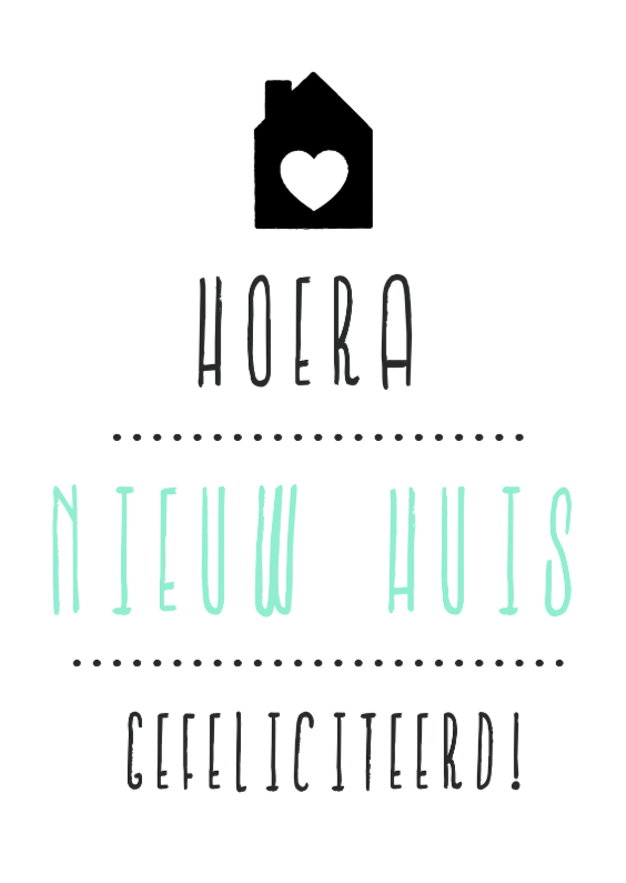 Hippe felicitatiekaart om iemand te feliciteren met een nieuw huis in een zeefdruk stijl. Met de tekst "Hoera, nieuw huis, gefeliciteerd"