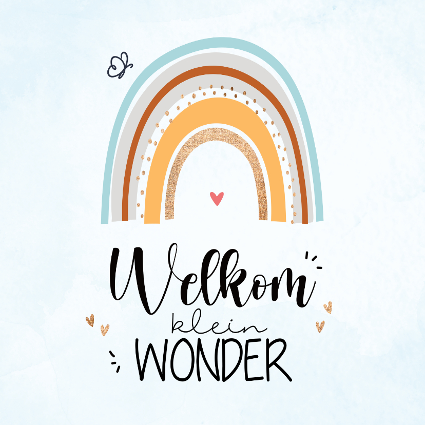 Felicitatiekaart voor de geboorte van een jongen met een lief regenboogje, een vlinder en hartjes in goudlook op een blauwe watercolor achtergrond