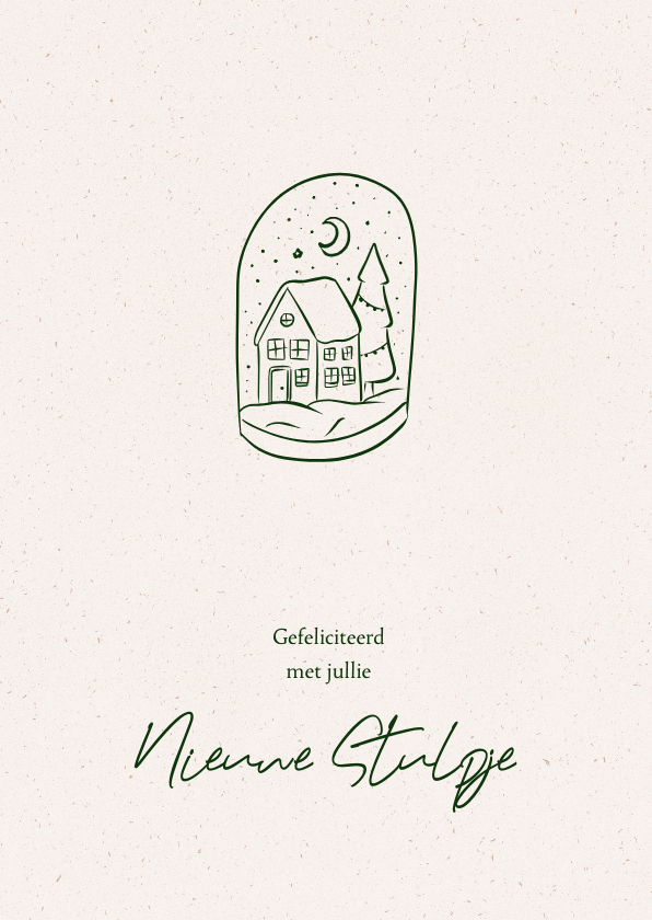 Een mooie subtiele felicitatiekaart voor een verhuizing met een lijntekening van een huis met boom en maan in een sneeuwbol. Hoera een nieuw stulpje.