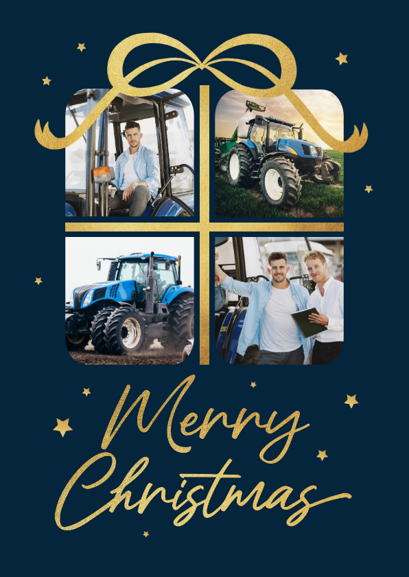 Een zakelijke kerstgroet met een persoonlijk tintje, waarbij foto's van uw bedrijf zijn verwerkt in de vorm van een cadeau. Met sprankelende sterren.