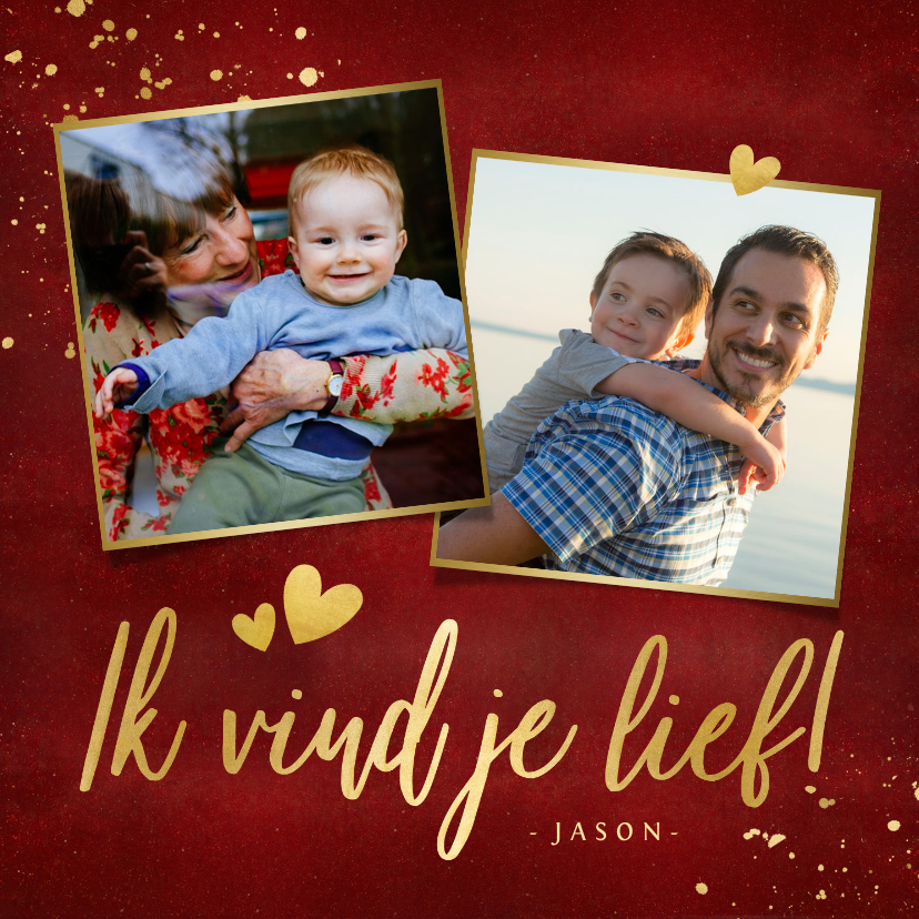 Laat iemand weten dat je aan iemand denkt met deze 'ik vind je lief' kaart. Bijvoorbeeld voor opa of oma. Met ruimte voor 2 eigen foto's en naam.