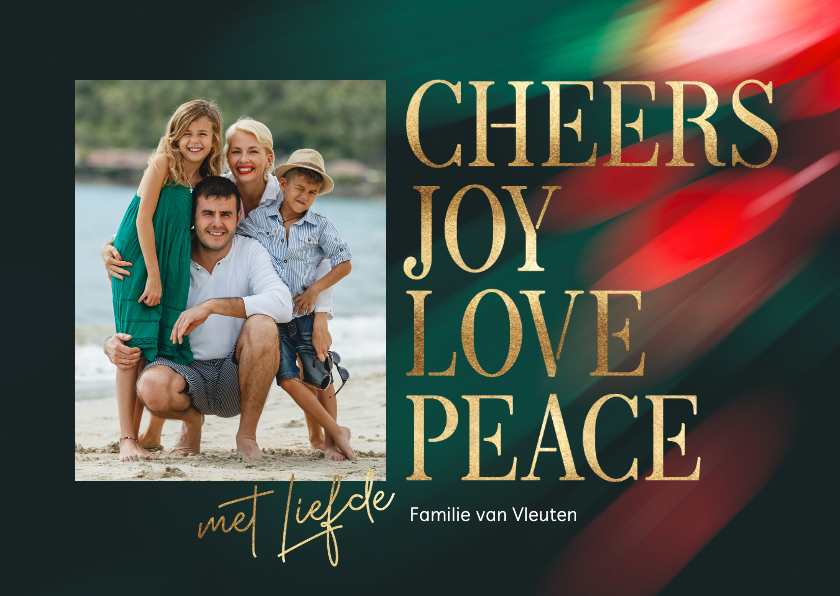 Stuur deze foto kerstkaarten met liefde naar al je familie. Op de kaart staat Cheers, Joy, Love en Peace. Ook goed te gebruiken als nieuwjaarskaart.