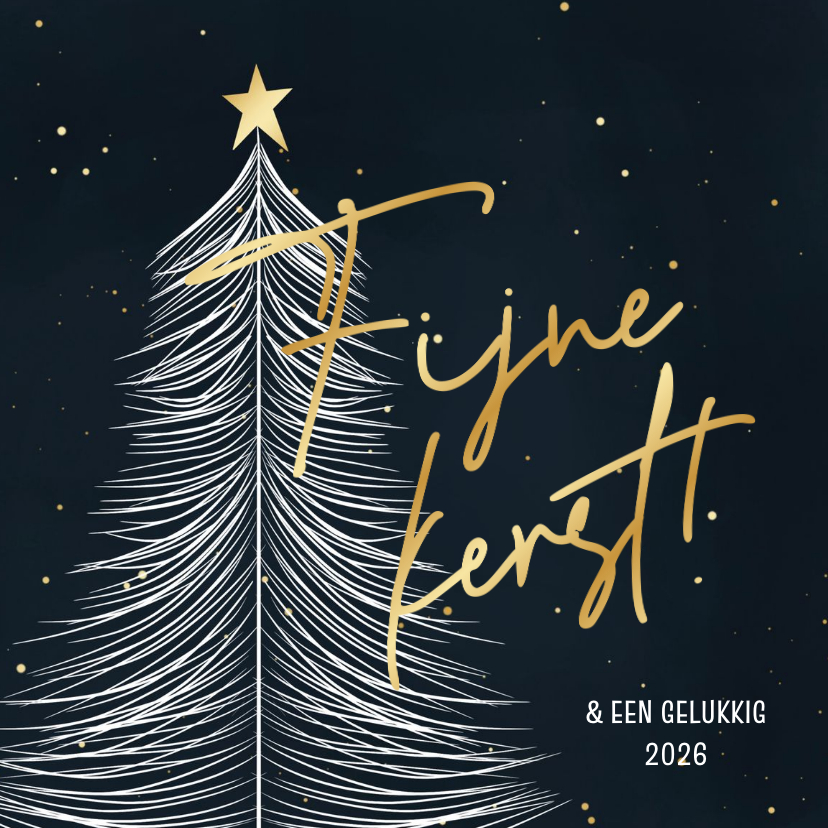 Stijlvol vierkant kerstkaartje met een lijntekening van een kerstboom en goudfolie tekst. Op de achtergrond waterverf en goudlook stipjes.