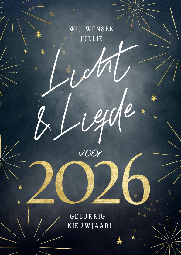Nieuwjaarskaart licht liefde goud vuurwerk 2026