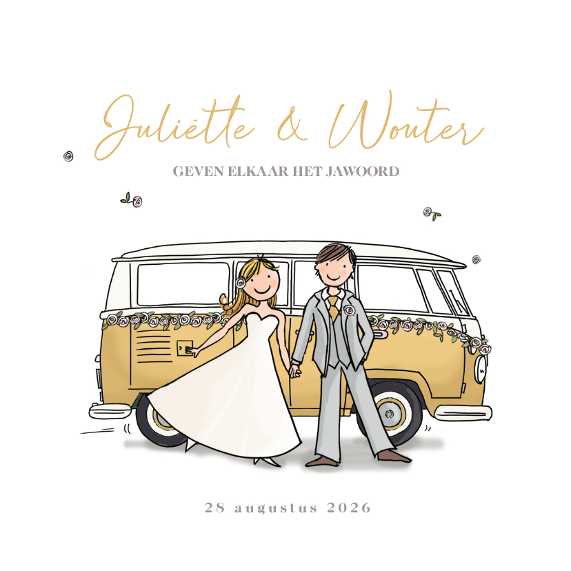 Trouwkaart VW bus bruidspaar