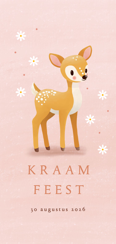 Lieve uitnodiging voor een kraamfeest van meisje met een illustratie van een hertje, bloemen en waterverf achtergrond.