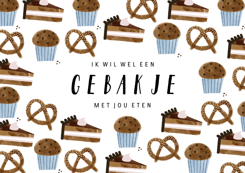 Leuke valentijnskaart met gebakjes, pretzels en cupcakes patroon met 'Ik wil wel een gebakje eten met jou' quote.