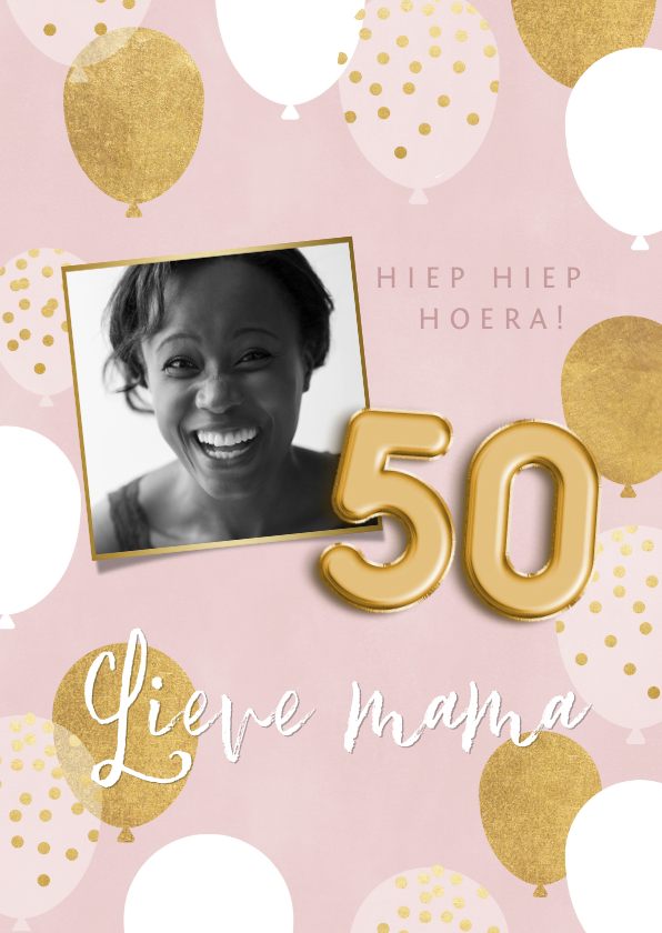 Verjaardagskaart voor een vrouw met goudlook, witte en confetti ballonnen, roze achtergrond en ruimte voor een leuke foto en de naam van de jarige!