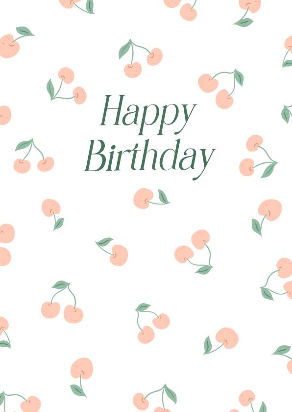 Een schattig wit verjaardagskaartje met een patroontje van zachtroze kersjes.