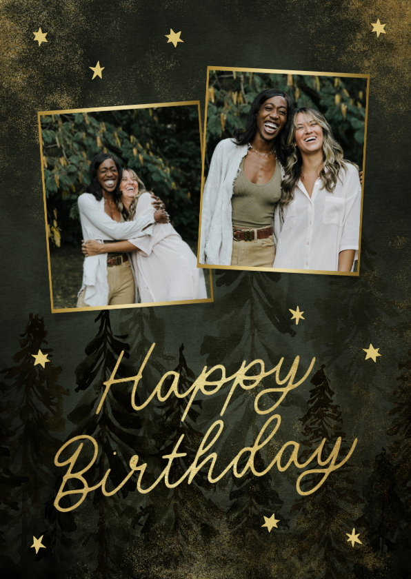 Moderne groene verjaardagskaart 'Happy Birthday' met twee foto's, aquarel stijl kerstbomen op de achtergrond en trendy gouden sterren.