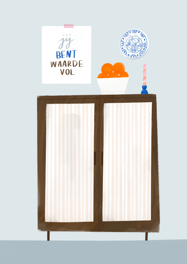 Bemoedigende wenskaart jij bent waardevol met aanpasbare (bijbel)tekst en servies kast illustratie.