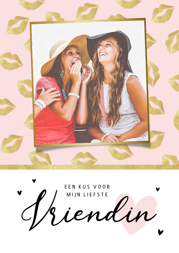 Een hippe en liefdevolle kaart voor een vriend of vriendin. Met gouden kusjes, hartjes en eigen foto.