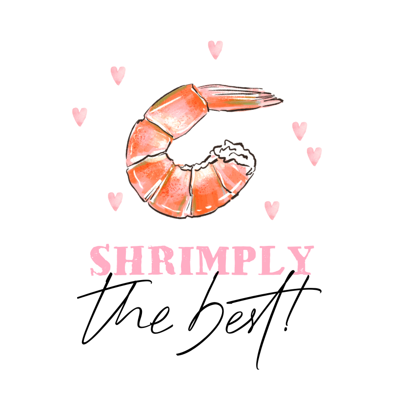 Grappige kaart ‘Shrimply the best!’ Illustratie garnaal, hartjes en trendy typografie om iemand te laten weten hoe blij je met hem/haar bent.