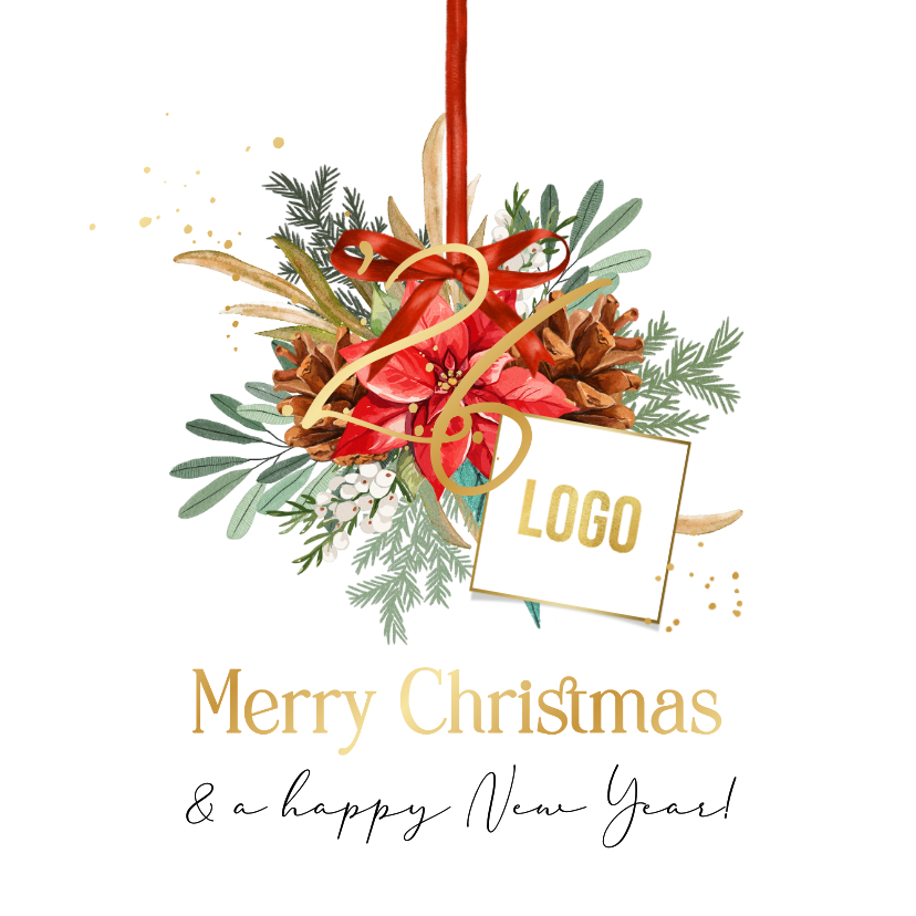 Stijlvol klassieke kerstkaart zakelijk met botanische bladeren watercolor, kerstster, dennenappel, jaartal, logo en laag goudfolie. Pas naar wens aan.