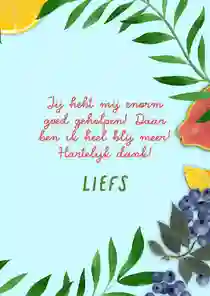 Hou het simpel: met je kaart zeg je al ‘bedankt’. Woorden als Dankjewel dat je er voor me was, Ik waardeer je hulp of Bedankt voor het oppassen zeggen vaak al genoeg.