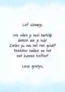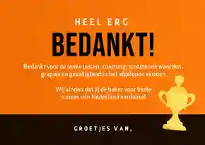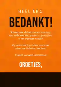 Leren doe je niet alleen op school. Er zijn ook een heleboel lieve coaches en trainers die hebben geholpen bij je sportieve ontwikkeling. Misschien heb je dit jaar wel leren dribbelen bij voetbal of kun je sinds kort een bal opslaan bij volleybal. Stoer hoor! Vergeet dus niet om ook je sportieve meester of juf te bedanken met een kaartje. Want of je nu op het veld of in het lokaal stond; een bedankje is op z'n plek.
