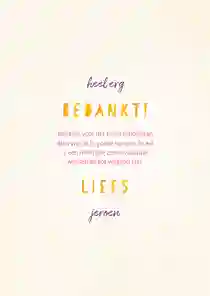 Soms wil je iets meer geven dan alleen een kaartje. Voor dat soort momenten hebben we leuke cadeaus voor bij je kaart. Zet juf bijvoorbeeld in het zonnetje met een Tony's bedanktreep. Of verras je meester met onze 'Bedankt' stroopwafels. Ook leuk: bestel een cadeau met een eigen foto. Juf of meester zal in de wolken zijn met jouw persoonlijke merci of mok!