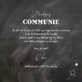 Heb je een leuke communiekaart voor je jongen gevonden, dan kun je ‘m in onze kaartmaker heel makkelijk persoonlijk maken. Ga samen met jullie zoon aan de slag zodat het echt zijn eigen ontwerp wordt. Met de volgende tips maak je de uitnodiging voor de communie van je jongen extra speciaal.