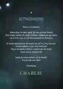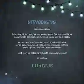 Een stoere bedankkaart voor een communie of lentefeest met blauwe en groene houten wegwijzers en lampjes. Leuk met eigen foto.