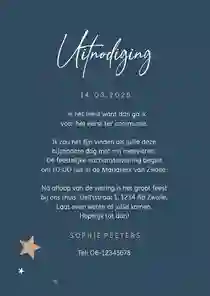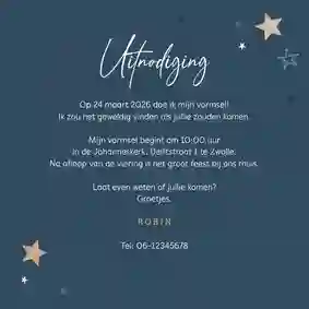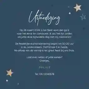 Hip bedankkaartje voor een communiefeest voor een jongen of meisje met houten sterren en eigen fotocollage. De achtergrondkleur is aanpasbaar.