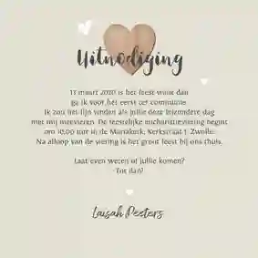 Hip bedankkaartje voor een communie of lentefeest met persoonlijke fotocollage en houten hartjes. De achtergrondkleur is aanpasbaar.
