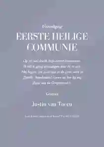 Een klassieke menukaart voor communie in blauwe kleur met een subtiele illustratie van een vredesduifje.