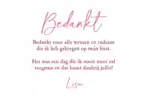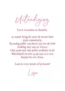 Een menukaart voor een communiefeest met roze strikje, sterretjes en eigen foto.
