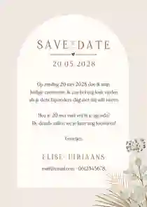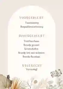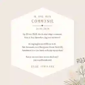 Stijlvol liggende kaartje om de gasten te bedanken voor de komst tijdens de eerste communie. Met 3 eigen foto's in boogvorm en droogbloem illustraties