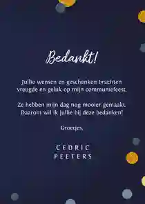 Stijlvolle en hippe uitnodigingskaart voor een Communie of Vormsel met gouden kruis patroon en confetti