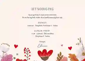 De eerste heilige communie van jullie meisje is een speciale gebeurtenis. En dat wil je natuurlijk vieren met familie, vriendjes en vriendinnetjes. Stuur daarom alvast een communie uitnodiging, zodat je deze bijzondere dag kunt delen met je dierbaarste mensen. Duik samen met jullie dochter in de collectie ‘Communiekaart meisje’ en ga op zoek naar de uitnodiging waar jullie hart sneller van gaat kloppen.