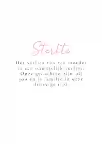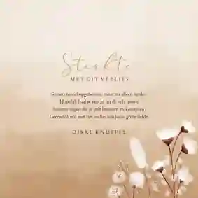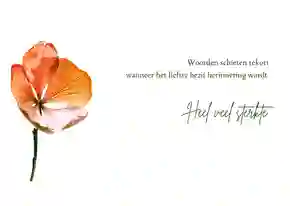 Een bloem staat voor stilte, licht, kalmte, liefde en natuur. Dat zijn mooie betekenissen om iemand steun te geven in de moeilijke periode. De bloemen condoleancekaarten zijn er in vele soorten, zoals een volle bos bloemen, een betekenisvolle bloem of juist een subtiele bloem. Kies bijvoorbeeld voor een condoleancekaart met paardenbloem (klap)roos of orchidee. Zo is er voor iedereen een geschikt kaartje waar diegene kracht uit kan halen.