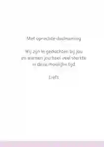 Een bloem staat voor stilte, licht, kalmte, liefde en natuur. Dat zijn mooie betekenissen om iemand steun te geven in de moeilijke periode. De bloemen condoleancekaarten zijn er in vele soorten, zoals een volle bos bloemen, een betekenisvolle bloem of juist een subtiele bloem. Kies bijvoorbeeld voor een condoleancekaart met paardenbloem (klap)roos of orchidee. Zo is er voor iedereen een geschikt kaartje waar diegene kracht uit kan halen.