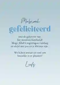Mabrouk! Er is een kindje geboren – een bijzonder moment vol liefde, dankbaarheid en gebeden. Of het nu gaat om een zoon of een dochter: in de islam wordt een geboorte gezien als een zegen van Allah. En daarom is een warm felicitatiekaartje perfect om het nieuwe wondertje te verwelkomen. Vind je favoriete kaartje en maak ‘m persoonlijk.