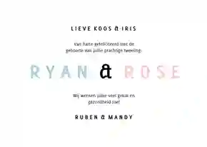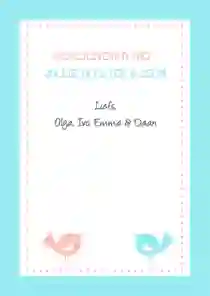 Naast een flink aantal kaarten voor twee jongens en twee meisjes, hebben onze designers ook felicitatiekaarten met roze en blauwe elementen gemaakt voor tweelingen van een verschillend geslacht. Maar je kunt natuurlijk ook altijd kiezen voor mooie neutrale kaarten in zacht beige, mooie tonen groen of stoere aardetinten.
