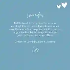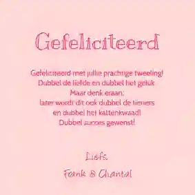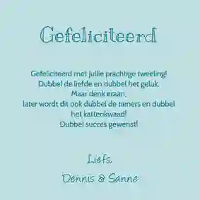 De tekst op de meeste tweeling felicitatiekaarten is gemakkelijk aan te passen. Zo kun je in een paar tikken op het toetsenbord dubbel geluk veranderen in dubbel feest of hello babies in hello little ones. Aan de binnenkant van de kaart staat vaak al een kort gedichtje of een quote over tweeling zijn. Deze tekst mag je laten staan, maar ook aanpassen naar wat anders. Zet bijvoorbeeld zelf wat moois op papier of laat je inspireren door onze blog met geboortefelicitaties.