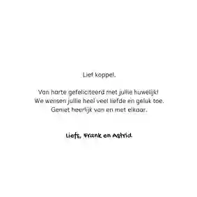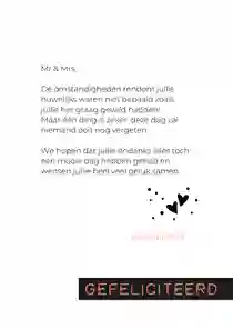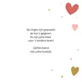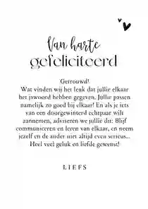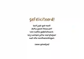 Hebben de tortelduifjes gekozen voor een intieme bruiloft? Of is het – om welke reden dan ook – niet mogelijk om bij het huwelijk aanwezig te zijn? Stuur de felicitatiewensen dan naar het getrouwde stel op. Net als voor elke andere kaart geldt: voor 21:00 uur ‘s avonds besteld = dezelfde dag verzonden.