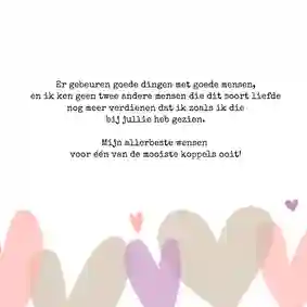 Op hun trouwdag ontvangen de newly weds naast een tafel vol cadeaus ook tientallen kaarten. Stuk voor stuk met een mooi gedicht of een liefdevolle spreuk. Opvallen tussen al deze huwelijkswensen? Pik een kaart uit onze felicitatiekaarten en geef er een eigen draai aan.