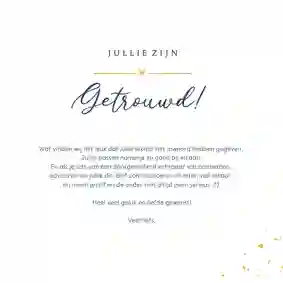 Is de kaart om door een ringetje te halen? Start de drukpersen! De meeste genodigden nemen de felicitatiekaarten mee naar de bruiloft en leggen deze samen met hun cadeaus op de daarvoor bestemde tafel. Opvallen tussen de zee van witte enveloppen? Kies dan voor een gouden, zilveren of parelmoeren exemplaar.