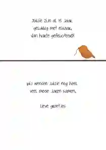 Een kaart in de brievenbus is altijd een verrassing. Maar het is extra leuk op een bijzondere dag: het huwelijksjubileum. Bij Kaartje2go heb je keuze uit diverse felicitatiekaarten voor een huwelijksjubileum. Het kiezen van een trouwdag kaartje is heel simpel. Je kiest in het filtermenu een stijl die bij het stel past. Is humor kenmerkend voor het getrouwde stel of past modern, klassiek of hip beter bij ze? De keuze is aan jou. Daarnaast kun je een selectie van de kaarten maken door te kiezen voor een specifiek thema, bijvoorbeeld bloemen, Christelijk of dieren. Ook speciaal voor het koperen, zilveren en gouden huwelijk hebben we een ruim aanbod felicitatiekaarten.