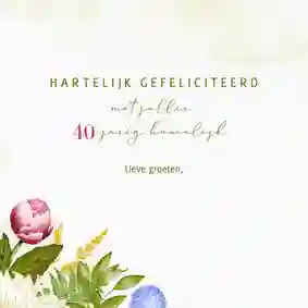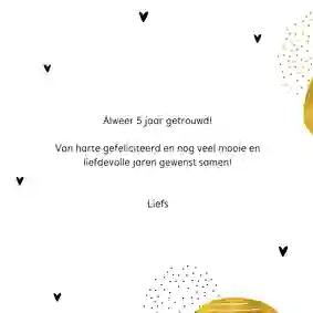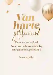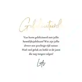 Het is feest, want een stel in jouw omgeving is zoveel jaar getrouwd. Of ze nu een jaar, 10 jaar of zelfs 50 jaar getrouwd zijn; de liefde mag gevierd worden. Zo’n huwelijksdag is natuurlijk een extra bijzonder moment om bij stil te staan. Een felicitatie mag daarin niet ontbreken. Feliciteer het stel door een felicitatiekaart voor hun huwelijksjubileum te sturen.
