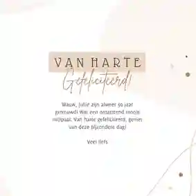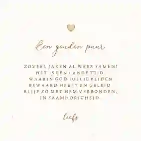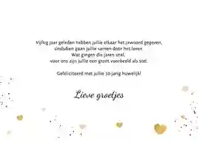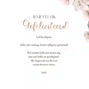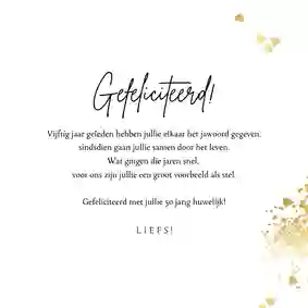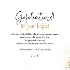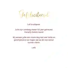 Als het gouden huwelijk geen reden is om een leuke felicitatie te sturen aan het echtpaar! Kijk eens naar ons ruim assortiment aan 50 jaar getrouwd felicitatiekaarten en kies het kaartje uit dat persoonlijk is, maar ook bij het echtpaar past.