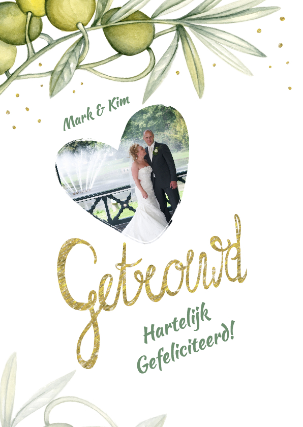 Felicitatie voor een huwelijk met mooie olijftak in aquarel en handettering in goudkleur niet echt goudfolie gedrukt