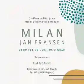 Wil je graag een anders-dan-anders geboortekaartje? Dan is een abstract geboortekaartje echt iets voor jullie! Deze kaartjes vallen op door de bijzondere kleuren, abstracte vormen en speelse lijnen. En het grootste voordeel is dat abstracte geboortekaartjes hartstikke uniseks zijn. Je kunt de kaartjes in onze kaartmaker aanpassen met verschillende kleuren, achtergronden, teksten en foto’s. Zo tover je iedere babykaart binnen een mum van tijd om tot een persoonlijk exemplaar.