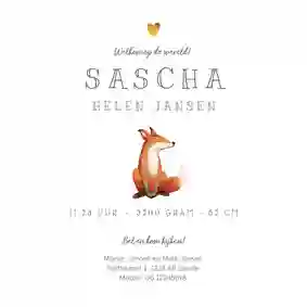 Hoera, babygeluk! Wat een mooi nieuws dat jullie binnenkort een zoontje of dochtertje in jullie armen mogen sluiten. We helpen je graag met het uitzoeken van het perfecte geboortekaartje. Op deze pagina vind je al onze geboortekaartjes met vos. Met hun roodbruine vacht, schattige snuit en opgestoken oren staan vosjes erg leuk op een geboortekaartje. Kies bijvoorbeeld voor een kaartje met een silhouet of illustratie van een vos. Passend voor zowel meisjes als jongens! Wist je trouwens dat een vos een echt groepsdier is? Dit maakt een geboortekaartje met vos extra leuk voor een broertje of zusje, of groot gezin geboortekaartje.