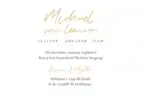 Ook klassieke ontwerpen met luxe details doen het goed. Denk aan sierlijke typografie, een rustige lay-out en foliedruk als blikvanger. Zoek je iets vrolijkers? Dan zijn geboortekaartjes met dieren, jungle thema's of speelse illustraties juist heel geschikt. Extra fijn: met onze handige kaartmaker kun je het ultieme geboortekaartje voor je zoon volledig aanpassen.