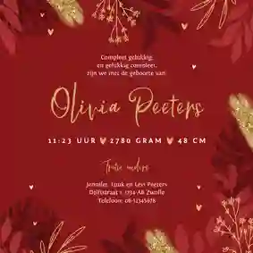 Bij Kaartje2go vind je niet alleen geboortekaartjes voor jullie dochter. Je kunt er terecht voor álle bijzondere momenten rond de zwangerschap en geboorte. Denk aan kaarten voor de zwangerschapsaankondiging, vrolijke geboorteborden voor op het raam of in de tuin, uitnodigingen voor de babyshower en kaartjes voor de kraamvisite. Alles is eenvoudig aan te passen aan jullie eigen stijl, zodat elke stap in deze periode persoonlijk en bijzonder voelt. Zo maken we het kiezen én bestellen snel, overzichtelijk en helemaal passend bij jullie gezin.
