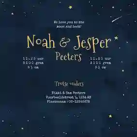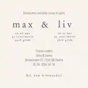 We kunnen ons ook goed voorstellen dat je voor elk kindje een geboortekaartje wilt sturen. Ze zijn dan wel een tweeling, het zijn ook twee verschillende kindjes. Extra makkelijk en leuk is het dan om twee enkele geboortekaartjes in één envelop te versturen. Zo wordt het één aankondiging, met voor elk kindje een eigen kaartje. Bekijk in dat geval ook onze andere geboortekaartjes.