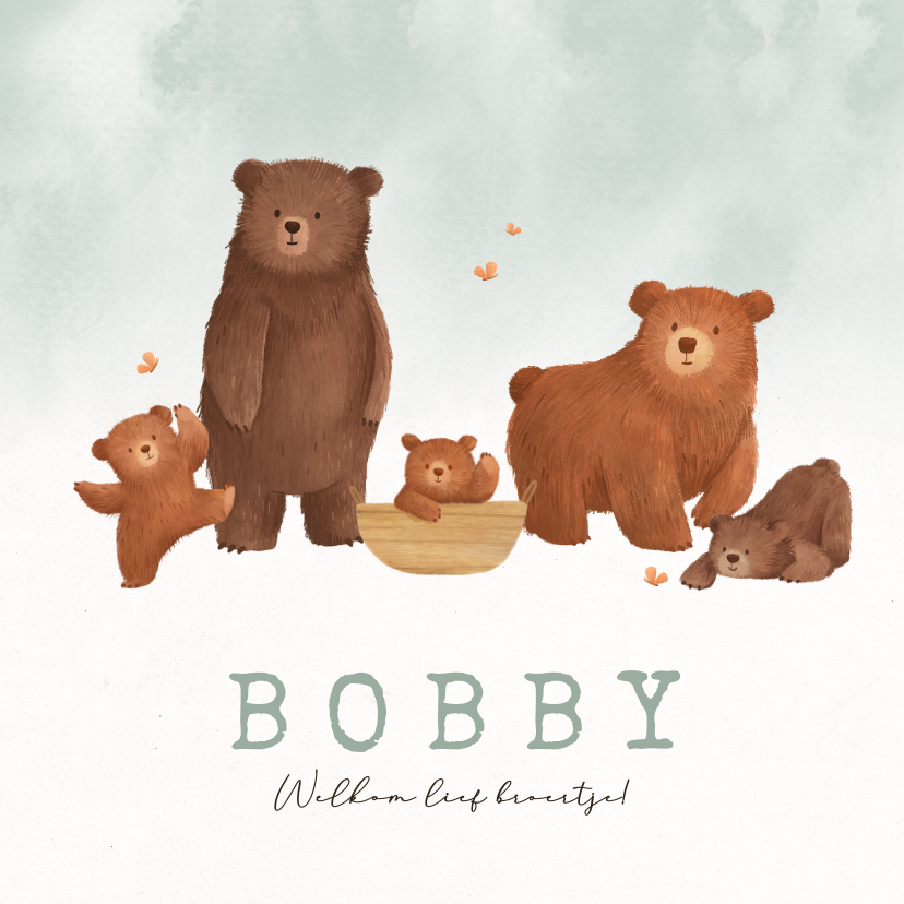 Een beregezellig geboortekaartje met schattige beertjes op een waterverf achtergrond. De tekst is volledig aanpasbaar.